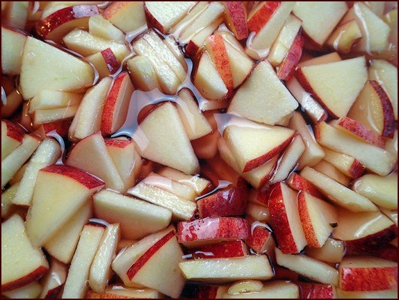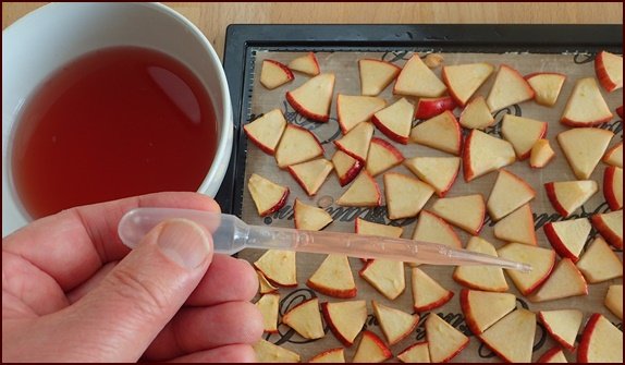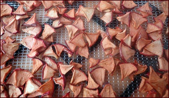 Cranberry-Infused ApplesI had better results drying apples basted with cranberry juice. Leaving the skins on to retain the flavonoids, I cut six apples into eighths and sliced those pieces thinly. As I cut the apples, I dropped the pieces into two cups of cranberry juice. I then placed the apple pieces on two dehydrator trays over nonstick sheets. Normally I don’t use nonstick sheets when drying apples, but it was necessary to keep the cranberry juice from rolling off as it was added during the drying process. After all the juices had been absorbed into the apples, I removed the nonstick sheets.