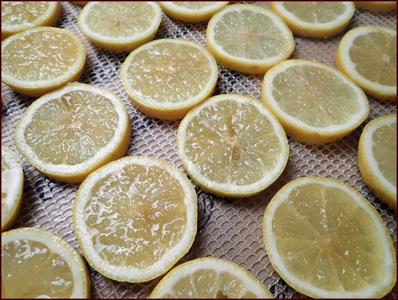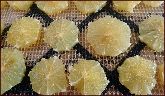 I should have remembered from all the different fruit leathers we have made, that adding too much sugar or honey causes stickiness. Perhaps Google could have reminded me that, “when simple sugars are heated, they melt and break down into glucose and fructose. The increase in temperature causes the sugar to darken in color.” The sugar-spiked lemon slices took a long time to dry. With each passing hour, they got stickier and browner. Obligated as I was to see the experiment through, I took one swig of the resulting caramelized lemonade before dispatching the project to the compost bin.