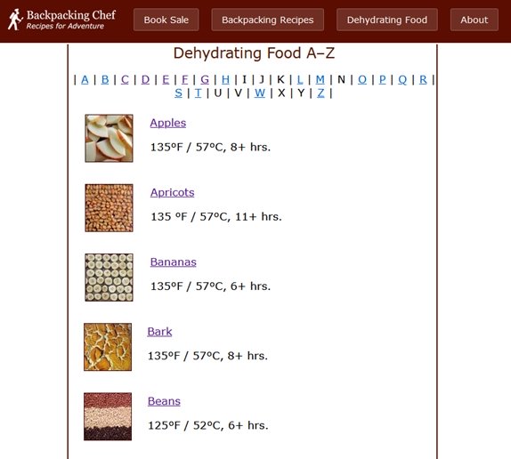 Trail MaintenanceMy work on the website is like trail work. Some days I blaze a trail (add a new page), and some days I do trail maintenance (update pages, fix broken links, improve navigation, etc.)I spent more than a few days last month improving navigation of the main Dehydrating Food page. That page is the hub, kind of like base camp, where you can set out to explore over 50 pages of dehydration topics, from apples to zucchinis. To make topics easier to find, I moved the A–Z list on that page from the side column to the main content column. Mobile phone surfers will find it quicker now. I added a photo icon next to each food, and a line about temperature and minimum drying time.