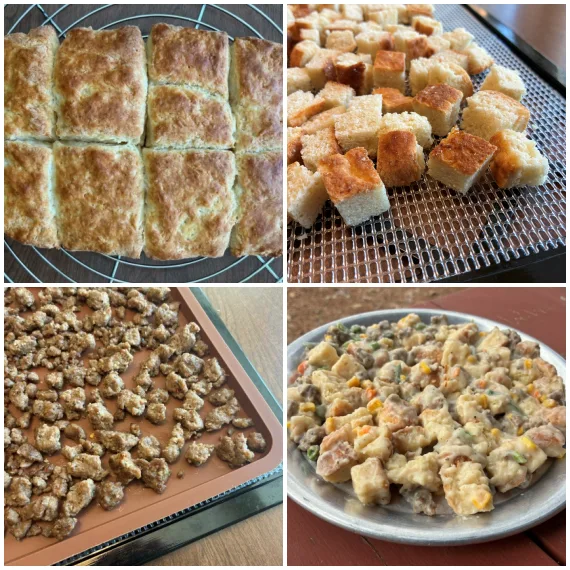 | Hello Chef, Do you know the definition of a “shaggy” dough? Before launching this month’s newsletter featuring buttermilk biscuits, I had never heard of shaggy dough. Dominique is the baker in our home. So, I looked it up: Shaggy dough is a rough and lumpy mixture of ingredients in baking, where flour and liquids are combined just enough to have no dry spots, but before the dough becomes smooth and elastic. If you want flaky buttermilk biscuits, shaggy dough is the way to go. We all need biscuits, but we should not knead them too much. For this edition of Trail Bytes, I drew inspiration from a buttermilk biscuits & sausage gravy recipe shared by Lora from Oregon, USA. Lora uses my method for cooking and dehydrating sausage-seasoned ground beef. I have used it in grits and omelet bites recipes. Dominique oversaw the baking of the biscuits. I cooked a pound of sausage-seasoned ground beef and managed the dehydration. In addition to Lora’s recipe, we added a recipe for biscuits & chicken.