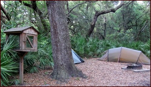 Our campsite with raccoon resistant food storage box. The main purpose of the Ranger talk is to inform you about the island’s notorious, food-stealing raccoons. On a previous trip, my friends put a cooler under a picnic table bench before we went to sleep so that the lid could not be raised. We had seen the eyes of raccoons reflected in the glow of our fire waiting in the saw palmetto for us to go to bed. During the night, a raccoon managed to get a hand in the cooler and extract a sticky bun. A noisy battle over that sticky bun ensued amongst the raccoons. On this trip, our food for two days fit into a small bag which we stowed in the food storage box at our site. We saw only one raccoon, and he walked away disappointed.