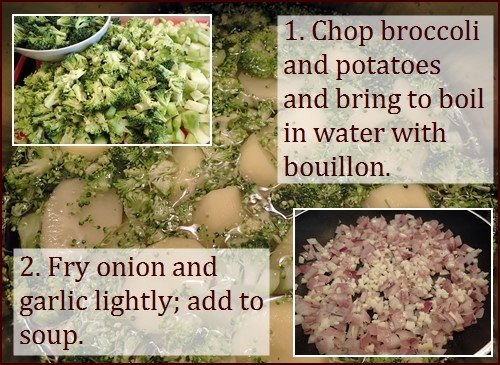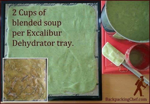Instructions: Peel potatoes and cut into chunks. Add to soup pot with seven cups broth, plus salt and pepper. Peel and discard toughest parts of broccoli skin. Chop broccoli, including stalks; hold back two cups of chopped broccoli and add the rest to the pot with potatoes. Bring to boil and then simmer on low. In a separate pan, lightly fry chopped onion and garlic. Three teaspoons of oil is sufficient. Add cooked onion and garlic to soup pot; continue simmering until potatoes and broccoli are soft. Turn off stove and allow soup to cool for a few minutes. In a separate pot, steam the two cups of broccoli that you set aside for three minutes using one cup of broth. Let broccoli cool (set aside to dry separately) and add cooking water to soup pot. Blend soup to a smoothie-like consistency with a regular blender or immersion blender. Dehydrate Soup Spread blended soup thinly on dehydrator trays covered with non-stick sheets. If using an Excalibur Dehydrator, spread two cups of blended soup per tray. For this recipe, I used four trays for the blended soup.
