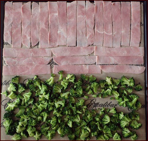 On a separate tray or trays, dry steamed broccoli and sliced ham. I had to dry both on one tray. Since broccoli florets break apart a little when dried, I used a non-stick sheet so none would fall through the mesh sheets.