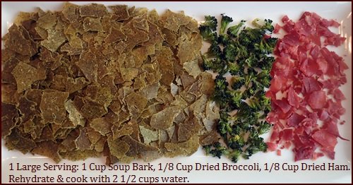 I dried the load at 135° F. The steamed broccoli and ham were dry after eight hours. The soup bark stayed in the dehydrator another four hours. After ten hours, the bark was dry enough to peel off the non-stick sheets and turn over on the mesh sheets without the non-stick sheets for the last two hours of drying time.