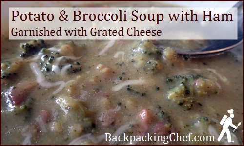 | Hello, For our last backpacking trip on the Appalachian Trail, I cooked Potato Leek Soup and Curry Carrot Soup in a Thermos Food Jar for a couple of our lunches. They were both delicious, but Dominique has asked me to include meat with our soup for a greater protein punch. One way that I will fix that will be to make beef jerky to serve with lunch. The other way will be to include meat in the soup. With that in mind, this week I made a very hearty pot of Potato Broccoli & Soup with Ham.