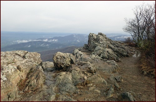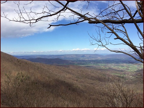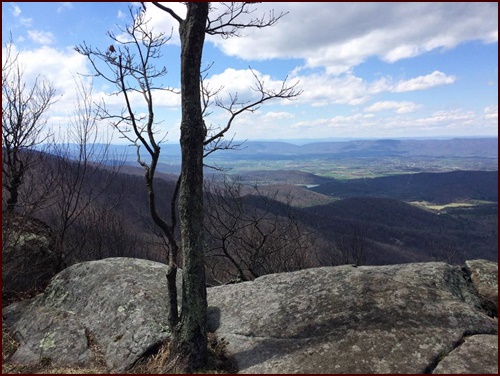| Hello, A few days after my youngest daughter got married in late March, with the newlyweds bound for Cancun, Mexico, Dominique and I drove six hundred miles north from our home in Georgia to Front Royal, Virginia to hike the northern half of the Appalachian Trail in Shenandoah National Park. We left spring behind; the blooming cherry and dogwood trees in our front yard and along the interstate gave way to the windy, leafless slopes of Old Man Shenandoah. After spending the first night in a hotel, we got a shuttle to Lewis Mountain Campground near the center of the park the next morning. Our plan was to hike fifty miles north, back to our car, which we had left at the home of our shuttle driver. For the first two days, we walked near the top of the mountain ridges with moderate gains and drops in elevation between three and four thousand feet. On the third and fourth days we descended into the two and three thousand foot range. Skyline Drive was rarely far away, but we hardly noticed that it was there. Walking mainly along the western facing slope, the views to our right were often uphill to rock formations ranging from craggy cliffs to boulder fields. To our left, we often looked out over the bare forest sloping down to the green farmland of the Shenandoah Valley. The colors surrounding us were brown and grey – hardwood trunks, branches, soil, rocks – and the predominant sound was of our boots swooshing though last year’s leaves. We noted approvingly any emerging weed or patch of moss.