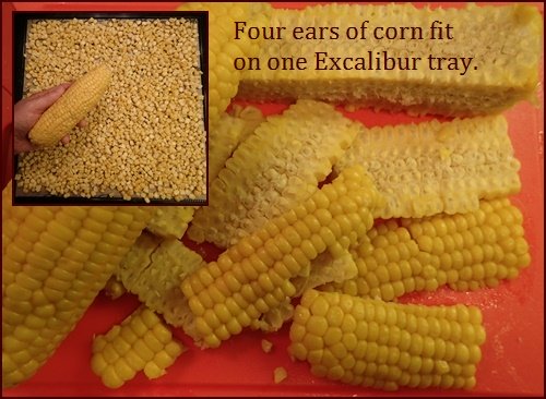 To dehydrate corn on the cob, cook it first. Bring a pot of unsalted water to a boil, add corn, and return to a boil for five minutes. Remove the corn and let it cool enough so you can handle it. Run a sharp knife down the cob under the kernels. You should be able to make four cuts, each with four to five rows of kernels. I did this around lunchtime, so I nibbled on what was left on the cobs. Separate the cut corn into individual kernels with your fingers and spread on a dehydrator tray with a non-stick sheet. I fit four ears of corn on one tray. Dehydrate at 125° F to 135° F for approximately twelve hours. Corn will be hard when dry with no moisture inside. Snacking Corn: Sweet corn makes a pretty good trail snack if you dry it most, but not all the way. After about eight hours of drying, check to see if the corn is mostly dry and try nibbling on a few kernels – it should be chewy with a little moisture inside. It will keep for several days in this partially dried state if you want to take a bag along on your weekend hike. Dried Yield: Four ears of corn on the cob filled 1⅓ cups and weighed 161 grams. To include one ear of corn on the cob in a meal, use ⅓ cup (dried), or 40 grams.