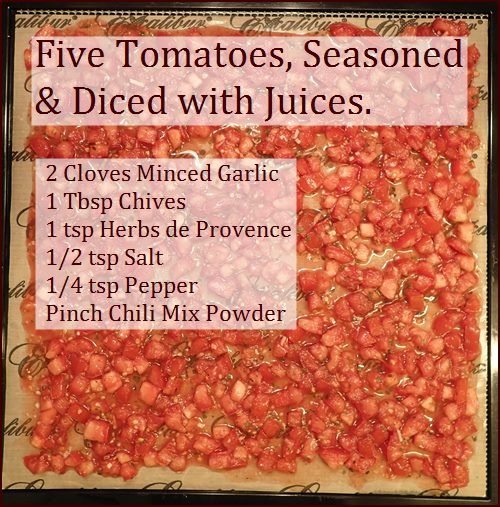 Dried Yield: Five tomatoes filled almost one cup and weighed 38 grams. To include approximately two tomatoes in a meal, use ¼ cup (dried), or 15 grams. Store dehydrated vegetables at home in air-tight containers. If you have a FoodSaver Vacuum Sealer, I highly recommend the inexpensive wide-mouth jar sealer accessory.