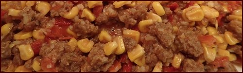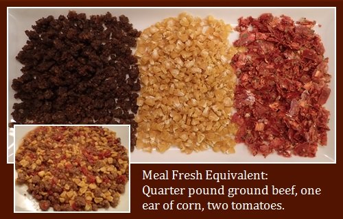 “Corned” Beef & Tomato RecipeWith the experiments complete, I combined the three foods into a one-pot meal. I wanted the portion to equal the quantity I might eat if the food had not been dehydrated: quarter pound of ground beef, one ear of corn on the cob, and two tomatoes.