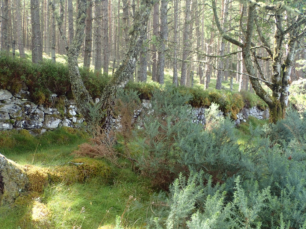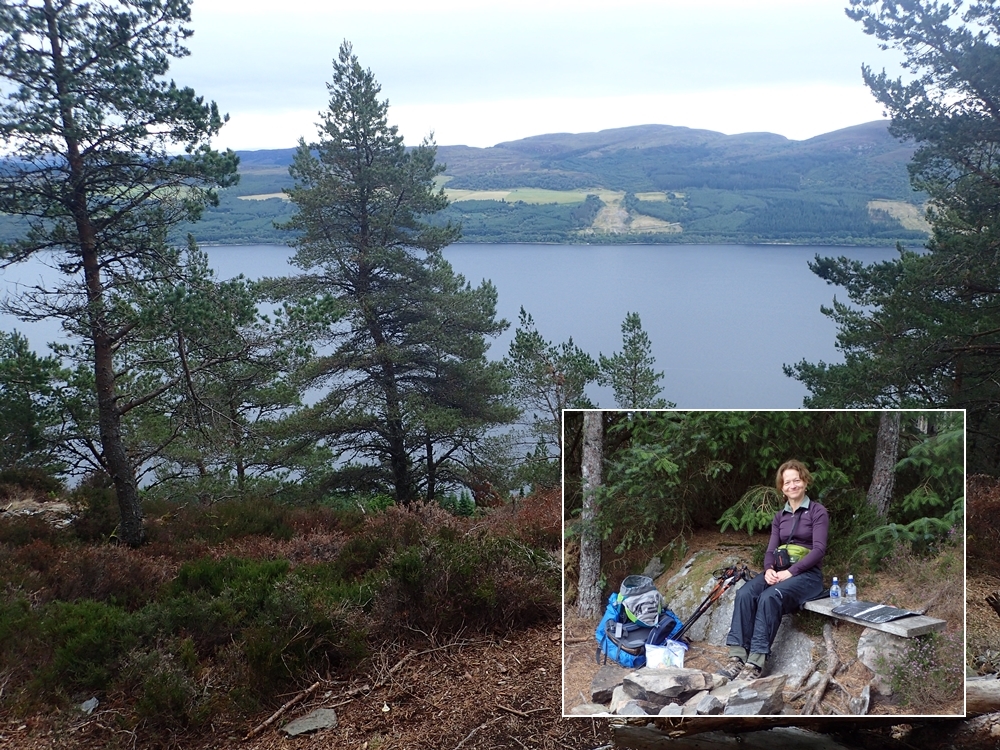 Today, we left the flat walking behind and took to the high route. The trail zigzagged up through a forest of huge deciduous trees and native Scots pines. We walked past secluded waterfalls and streams. Eventually, the trees gave way to grass, heather, and juniper bushes. Views opened up looking down over the tops of Scots pines to Loch Ness. Trees became sparce as we climbed up and across the open moorland.